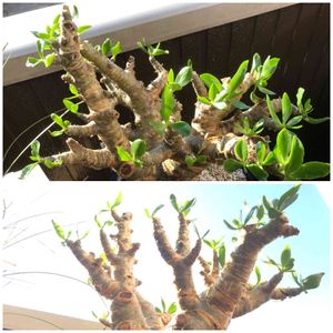 チレコドン レティキュラーツス 万物想 皮のめくれた幹の質感、多肉らしい葉っぱ、年月を感じさせるずっと残り続ける花柄、そして名前も、なにもかも大好きな植物です。🌏どこか他の惑星で永い年月を過ごしてきたかのような奇妙な見た目。これに万物想なんていう大袈裟な名前をつけてしまった人に思わず共感してしまいます☺️