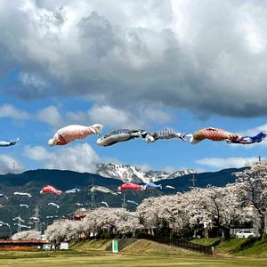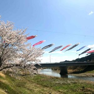 こどもの日🎏 雨が降ってきてしまいました。 気分だけでも爽やかに🤗 花桃の里には鯉のぼりも泳いでいます♪ 先月の写真より一枚✨