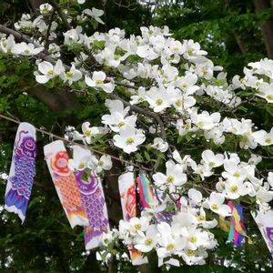 ハナミズキが満開になってきましたー。 プラス、鯉のぼり🎏 今日の1枚