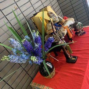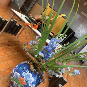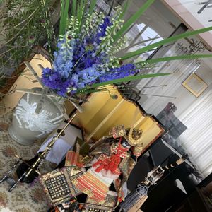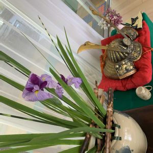 こどもの日 生け込み 立派な兜様に負けぬように真っ直ぐに伸びた刀の様な葉と濃いブルーの花の組み合わせにしてみました。