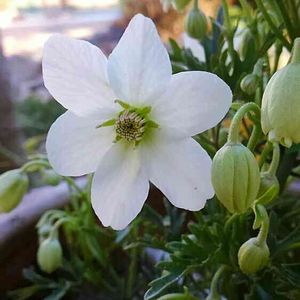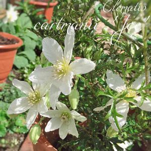 お花屋さんでクレマチスとタグがついていたので買ってみました💕蕾が沢山、白い花です😊 私の知っているクレマチスとは雰囲気が違うので調べてみました🤔多分、カートマニージョーではないかと。 常緑🌿で小型、花が沢山🌸🌸咲くそうです。 いいじゃない、咲かせてみよう❣️