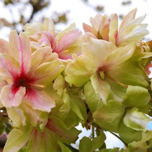御衣黄桜(ギョイコウザクラ) 御衣とは貴族の着物のことで、花色の薄い緑が平安時代の貴族の衣服の色(萌葱色)に近いことが由来だそうです。 花色が薄い緑→黄色→花の中心が赤く と変化していくそうです。