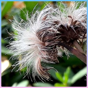 アザミの綿毛 娘が採種して紙コップに大事に取っておいたものをビニール袋に移して空気を含ませてみるとー… フワフワかわいい💕