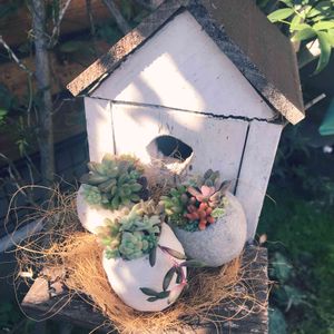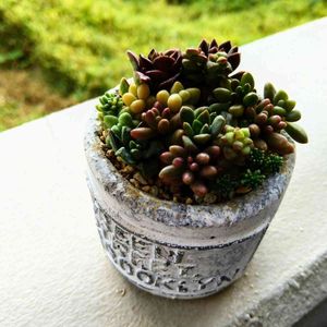自然乾燥、日光で固まる粘土で半年前に作った鳥さんの鉢ですがそのままになってました。 庭をよく見ると可愛く紅葉した子たちが沢山いましたので寄せ植えしてみました💖