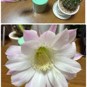 直径6センチ弱のサボテンが昨日大きな花を咲かせました、花茎がもげそうだったので缶に乗せました(笑)