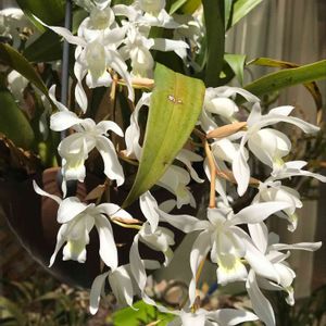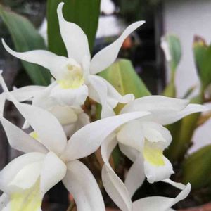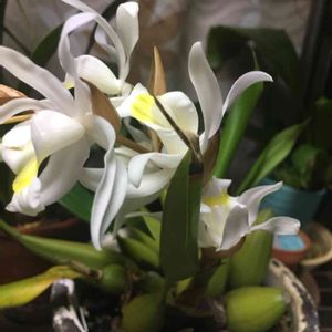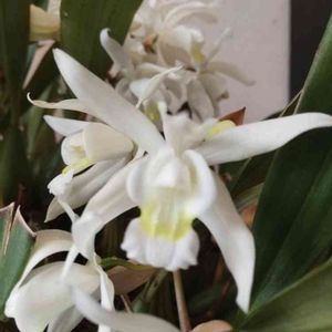 葉の陰に隠れてひっそり咲いてるセロジネ・インターメディア 3個のバルブから現在直径20センチオーバーの大株に育ってます❗