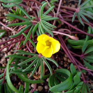 今朝の庭から 今日のお花 オキザリス ニューイエロー パーシーカラーのように縁に赤い色がのっています この蕾のまま一週間 まだ開いたところを見ていません パーシーカラーはやっと芽が出てきたところ🌱