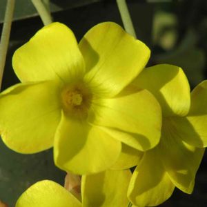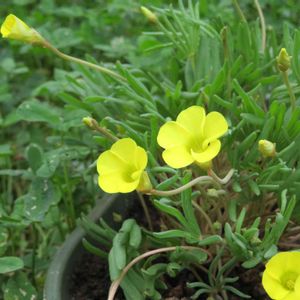 おはようございます😃 オキザリス ニューイエロー🌼 昨日の晴れ間に嬉しそうに お喋りしていました🎶🎶 昨年より小さめのお花 赤茶色のラインも薄めです☺️