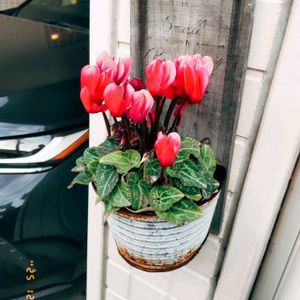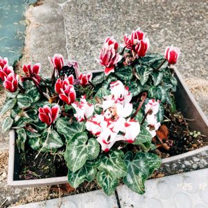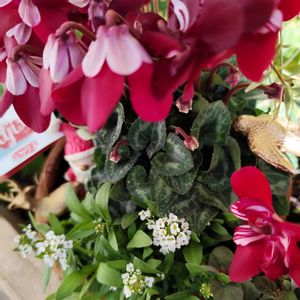 玄関前 少し🎄🧑🎄気分に シクラメン ジックス❁❤ 1つ アリッサム❁🤍 1つ 簡単寄せ植え