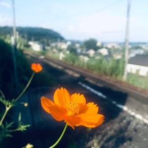 地元ローカル線の駅に オレンジのコスモスが キレイに咲いています