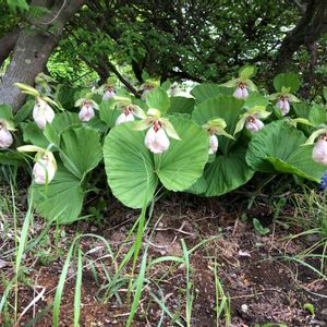 日本熊谷草の花が咲きました。 巾着型の花と大きく開いた葉 不思議な姿です。