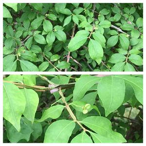 ニシキギの実 まだ若い実です。 これから丸くなり、色付くそうです😊 枝の翼というのも初めて見ました。 紅葉が楽しみな木です😆
