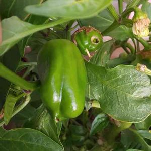 やっとピーマンらしくなりました😊 奥に写っているのは虫君の食料兼寒さからの避難場所になっているみたい💦