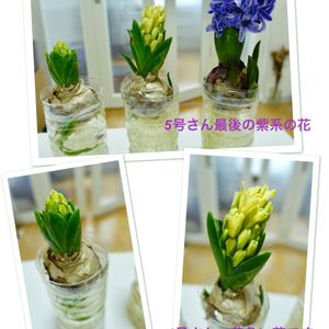 おはようございます😃 雨の日曜日で、皆さまいかがお過ごしでしょうか?ベランダでは、チューリップの鉢に小雨が降り込んでいます。 さて、いよいよヒヤシンス牧場(笑)も、終盤戦⁈ 5号さんは、白い縁取りの薄紫色の花を維持して良い香りを漂わせています。 そしてついに6号さんが咲き出しました❣️黄色い花です🌼7号さんも蕾がはっきり見えてきました❗️こちらも黄色系みたい。 3月までヒヤシンスを楽しんだことは今までありませんでした。もう少し楽しませてもらえそうです😄