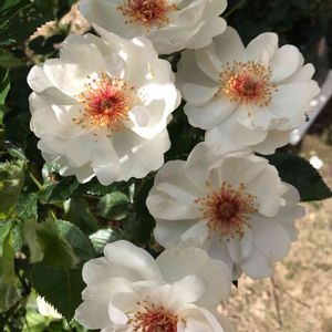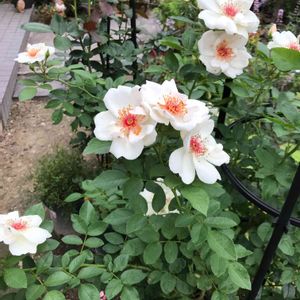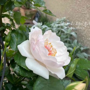私がフォローしている方のお庭を訪問してから さらに欲しい気持ちが強くなっていたバラ… 数週間ほど前に母とホームセンターに行った時 バラコーナーの隅っこに弱々しく佇んでいた彼女… よく見ると葉がうどんこ病?ぽく 連れて帰るかどうか悩んでいると 母が連れて帰りなさいよ!と買ってくれた( ・⊝・∞) これもなにかの"縁"と連れて帰り 日当たりと風通しがよい場所で様子を見ていると ひとまわり大きくなり(自己満足かな?)いつの間にか花芽がいくつも… そして今朝 開花 ✧︎*。 白い花びらに赤いおしべがとても素敵ね… 香りもよいわ♡︎ʾʾ ✿ ❀ 🌹 ジャクリーヌ デュ プレ 🌹✿ ❀