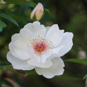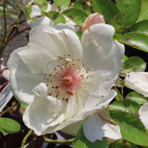 ジャクリーヌ・デュ・プレ 中輪/中香/四季咲き やさしい白い花びらに赤い花芯が印象的なバラ。このバラはこの雄しべの美しさなしには語れません。 日が暮れてくると、花びらが閉じるのも可愛いものです。 モダン・シュラブに分類され、高く枝が伸び、枝の先に房咲きとなり、四季咲き性も高いようです。 ムスクの香り。 英国の天才チェロリストで、難病のため42歳の若さで無くなった「ジャクリーヌ・デュ・プレ」(1945〜1987)に捧げられたバラです。