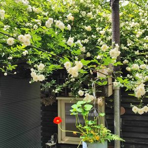 こんばんは🌼 木香薔薇が沢山咲いています🌼 庭側は白色、道路側は黄色です🌼