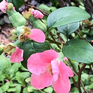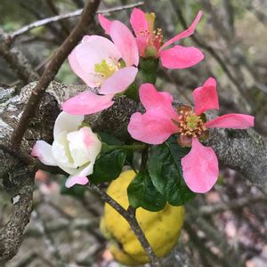木瓜(ボケ)・花と実 蕾から花が咲き、枯れて実が成る 一つの木で一緒に見れました この花は薄いピンク色 〈海辺の神社境内で〉