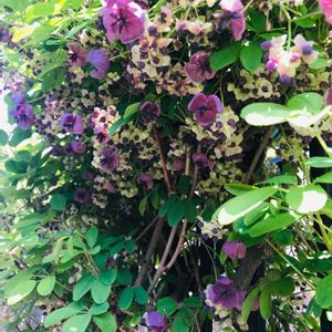 🌿アケビの花🌿 道路沿いのおうちのフェンスに アケビが絡ませてあり、たくさんのお花が咲いていました😊 実ったところもみたいな❣️