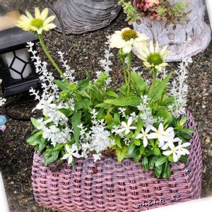 くすんだ(*^^*)桃色?¿ の籠鉢見つけた💓 やっぱり⚪️が好き 私が選ぶとこんな感じ〰️(๑・̑◡・̑๑) 色がない(・・?) ♡エキナセア パウワウホワイト ♡オレアリア リトルスモーキー ♡オリジナルビンカ 白→ 新しい今年からの生産数1000ポット未満の限定⁈って書いてある_φ( ̄ー ̄ )