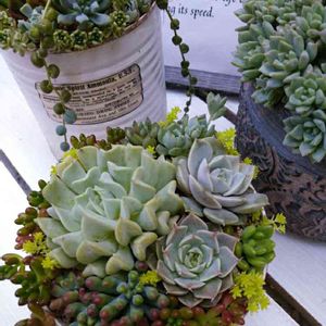 ✨宝石箱の出来上がり✨ 種類は少ないですが、一つ一つが増えてきたので 昔の花器に植え込みました。