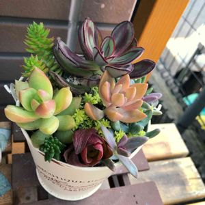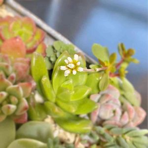 寄せ植えの中に小さなお花がちょこんと☺️ かわいい、、💕 雨が降ってきちゃったので、多肉ちゃんたち避難!