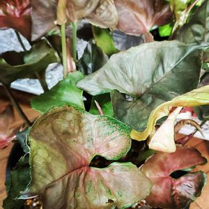 シンゴニウムと書いてあるけど、それ以上書いてなくて気になります💦 見たことないシンゴニウムなのですが、これの品種?がわかる方いますか? チョコレートとも違うと思います🙄 所々斑が入ってる葉もあります。