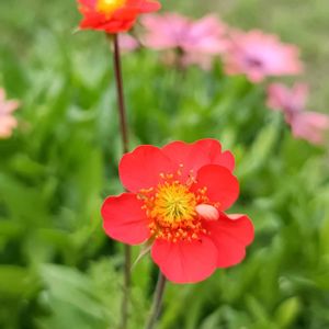 【ゲウム(西洋ダイコンソウ)】 西アジア、南ヨーロッパ原産、バラ科多年草 日本の山野に自生するダイコンソウの仲間。 花茎の先に径3~4cm程度の橙赤色の花をつける。 アブラナ科のダイコン(大根)とは関係ないが、根元の葉が大根の葉に似ていることから名づけられた。 開花時期:5~7月 草丈:10~45㎝ 花色:オレンジ色 ガーデンマルシェ防府にて