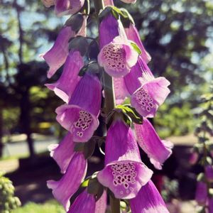 今日のお花 ジギタリス🩷💜と青いバラ🩵とハマナス🌺 1️⃣2️⃣ジギタリス オオバコ科 ジギタリス属 釣鐘状の下向きの花の中には沢山の斑点があります 3️⃣バラ 青龍 小林森治によって算出された作品で、最も青に近い品種 小林森治は純粋な交配のみで青いバラを作り出した、アマチュアの園芸家 咲いていた時に近い色合いで撮っていますが、時間と共に色変しているがしれません。 4️⃣青いバラ タグがないので不明ですが小林森治さんのであれば、ターンブルーかも 5️⃣ハマナス(浜茄子) バラ科 同属 海岸の砂地に生える