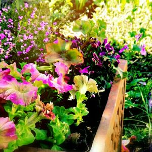 ペチュニアの変わった色が手に入ったので寄せ植えに加えました。後ろには菜の花チューリップ。春ですね。