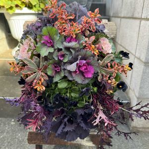 定期的に行きます。 ホームセンターパトロール👮 そろそろ秋冬苗がお安くなってるんじゃないかな〜と向かったところ、やっぱりたくさんあった! おしゃれハボタンの値引きが始まってる😆 スルーできないよね😁💕 あれこれ悩みながらクラシックカラーのハボタンとへーべ、エリカ、ヘデラ(これも安かった)をかごにイン。 「クラシックカラーでいくぞ!」というセレクトは家で組んでみたらちょっと全体的に渋すぎて…💦 おひとり様植えしていたフリルパンジー ラブリーシュシュさんに一緒に入ってもらいました🤭 さすがフリルパンジー、華やかにセンターを決めてくれました👍✨ うん!満足したー!😆✨