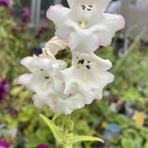 ほんのりピンクがかった白色のベル状の花「ペンステモン ‘アップルブロッサム’」。 可愛い花なのにオオバコ科だとは意外。