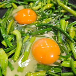 ニンニクの芽。とは知らず、なんじゃこりゃとみどりのQ&Aに質問するところだった。 玉子でとじて美味しくいただきました。