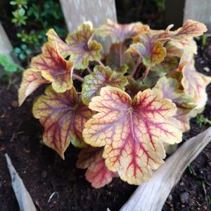🎀camellia ヒューケラ 2021年秋🎀 11🌱エレクトラ🌱 黄色っぽい葉に赤い葉脈が特徴のエレクトラ。秋になって一層際立ってきた葉脈がきれい。 この子も、昨年秋にネキリムシに襲われて室内で養生した株。今年は被害に遭わないようにヒューケラパトロールを強化しなくては。😅