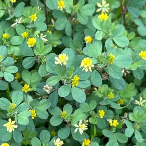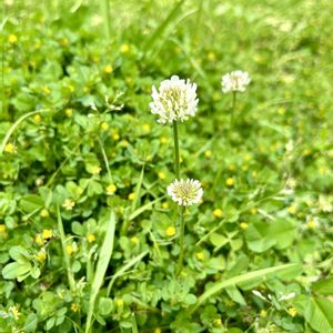 今日のお花🏷𓈒𓏸︎︎︎︎シロツメクサ 亀戸天神に藤見物に行く途中、昔ながらの団地を横切ってベンチで一休み。住民が思い思いに手入れする広場の花壇と芝生。 シロツメクサ🤍がコメツブツメクサ💛を従えて広がっていました