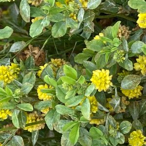 コメツブウマゴヤシ 米粒馬肥 マメ科ウマゴヤシ属の1年〜越年草 ヨーロッパ原産 帰化種 江戸時代に渡来し日本全土に分布 道端、草地、海岸で生育 3月の写真です。 沖縄に帰省した時に見っけて、初めて撮影したのに うっかり 投稿しそびれてしてました。 一昨日の コマツナギ 駒繋、 昨日の ウマノアシガタ 馬の脚形 に 引続き … 大好きな馬つながりってことで 投稿しちゃいます。 テヘペロ 花期は 5〜7月 ですが 沖縄では2月ごろから咲いているようです。 分岐した茎は地面を這い、斜上します 葉っぱは 3小葉 ↖ 20~30個の小さな小さなお花が 集まって付き 小さな球形になります。 ➘ そっくりさんの コメツブツメクサ 米粒詰草は 花後花びらが垂れ下がり 白く残りますが、 ➚ コメツブウマゴヤシは 花びらは落っこち 若い豆果が良く見えてます。 ↙ 黒く完熟すると 中には種子が1つずつ入ってます。 馬の飼料になり、米粒のように小さいことから このお名前がつけられたのだそう。 花言葉 小さな秘密 コメツブウマゴヤシ 撮影 2023 3/21 スマホ 沖縄 コメツブツメクサ 撮影 2022 5/23 公園 くらべっこ ★ どうぶつシリーズに追加
