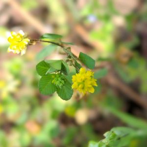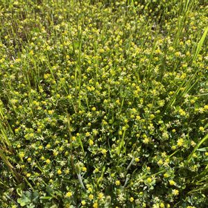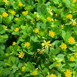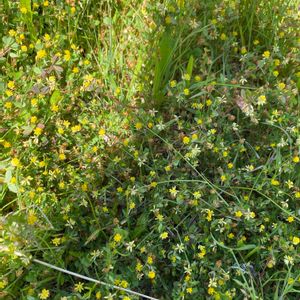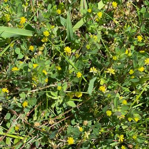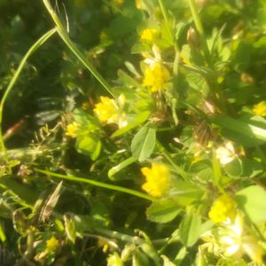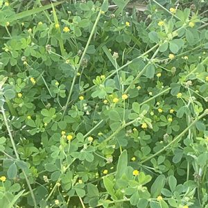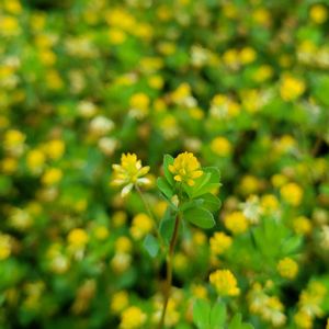 マメ科 シャジクソウ属 コメツブツメクサ 田んぼ道に生えていたコメツブツメクサ 小さな黄色い花で、よく見るとシロツメクサにそっくりです