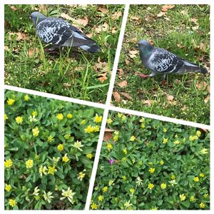 こんばんは 毎月月末は🏷トリの日に参加させていただきます🙇♀️💕🎶 ①米粒詰草🟡と鳩さん ツッタカタァー ツッタカタァー♬ 四つ葉のクローバーは無いかなぁ ② ↖️米粒詰草と大きな薬玉詰草🟡 ↘️米粒馬肥やしの小さなお花 鳩さん♡🍀☘️🍀☘️🍀