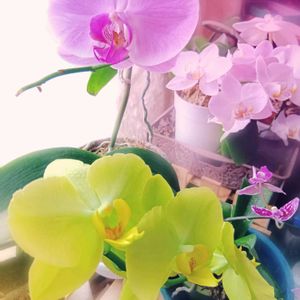 胡蝶蘭色々咲いてます🌸 黄色いやつは一昨年いただいたミディ胡蝶蘭が家で初開花だけど 何故か他と同じ肥料(少なめ)でも胡蝶蘭(上のピンク)並の大きさになっている🌸