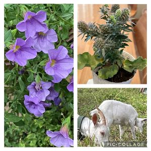 ⬅️「カリブラコア」 ↗️「エリンジウム」 ↘️子ヤギ3/27生まれ 自宅の花。 子ヤギは娘の家に3月に生まれました。手前は母ヤギです。