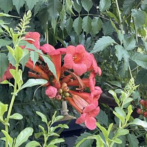 アメリカノウゼンカズラのようです (アメリカ原産/ノウゼンカズラは中国原産) 小湊鐵道『月崎駅』周辺散策中に 紅色が濃いです。 花筒部分がノウゼンカズラより長いです♪ 初めて見ました^_^