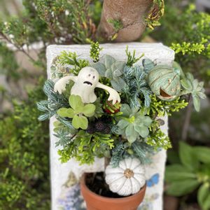 ハロウィン月間👻 庭に飾ってるモルタル雑貨に リーフや実を飾りました 植え付けてた多肉やセダムが 痩せ細ってきたから その隙間に... ちまちまと🤏🌿挿しました ツゲのように育ってる数年ものの 『カルーナ』の新芽は 若草色で美しいの💚 クリスマスの飾りに重宝する 『コニファー ボールバード (ブルーバード)』の色もいい♡ 黒実⚫️は『アロニア』です 庭のフェンスに並べたbook road 📖📖📖... 11月に入ったら 赤実のクランベリー🔴を 入れて行きましょう 『ジュズサンゴ』を散らしても いいね👍 しばし..多肉ちゃんセダムちゃん 窮屈だけど我慢してね😉