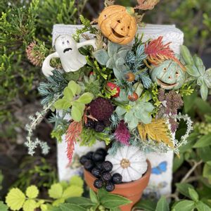 昨日のモルタル飾りを更に ハロウィン🎃👻っぽくしました 庭のドライ花材を使って 挿して🤏挿して🤏挿して🤏… ケイトウ セロシア シダ 三尺バーベナ ツクバネウツギ ガイラルディア グレープセンセーション クランベリー ローズヒップ オレアリア アフィン コニファー ボールバード アロニア 株元をスッキリさせると(pic⑤) スタンダード仕立てになってるの ステキな形です これは楽しめる🙌💕