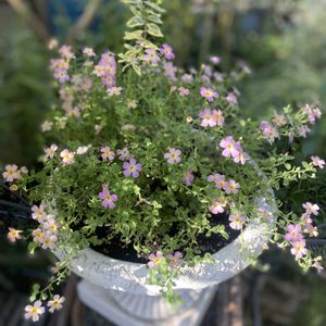 『ジャメスブリテニア サファリ ピーチサンセット』 以前に瀕死の状態で値下げされて ました🥀 「サンブリテニア」に似てるから 扱いが難しそう...と お迎えをためらいましたが この子は枝が割としっかりしていて サンブリテニアのように 枝に触れただけで🤏💥 折れそうにありません🫶 直径33cmの鉢植えに 広がって復活🙌 ピーチ➡️ピンク➡️ライトピンク と花色が変化します ☝️ノスタルジーな朝焼けピンクの グラデーションが美しい🙂↕️ 草丈 15〜30cm 葉幅 30〜60cm 花径 2〜3cm 花期 初夏〜晩秋 耐寒 −3℃ 切り戻した方がきれいに育つ✂️ ステラ(バコパ)の近縁種 初めて育ててます🔰 あまりの酷暑☀️なので シルバープリペットの木漏れ日で 過ごして貰ってます 気持ちいいかな〜🤗