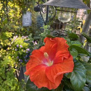 『ハイビスカス🌺ロングライフのポモナ』 やっと咲きました ツボミをたくさん蓄えた鉢植えを お迎えしたのに 一気にツボミが落ちました😓 それからポモナは置き場所を変えて ちょっと涼しいところへ... ハイビスカス ケイトとは違って 簡単に咲いてくれなかったケド 3週間経って 再び幾つかツボミを蓄え始めました グリーン🌿ばかりの庭に パッと🧡明るい大輪です🤗 オレンジ🧡色はハロウィンにも 使えるかなって思ってます♪