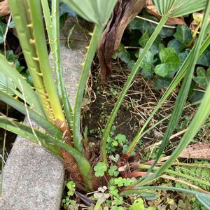地植えライトヤシの株元^ - ^ 先日子株の出現を発見しました(๑╹ω╹๑ ) 我が家の株立ちヤシの種類で初なので嬉しいです(*≧∀≦*)