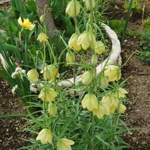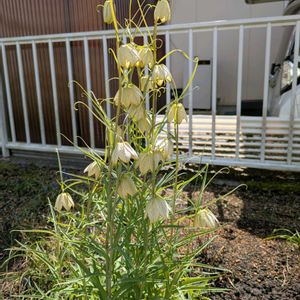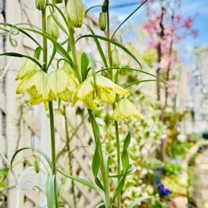 YS散歩🍀 今日の最高8℃最低5℃ 4月から除草が始まります。 130坪ほどのお宅の見積もりに 伺ったらお庭に咲いておりました 【アミガサユリ】🌿💛🌿 別名・バイモユリ テンガイユリ バイモ ユリ科 バイモ属 ユリ目 原産地・中国 花言葉「荘厳,凛とした姿」