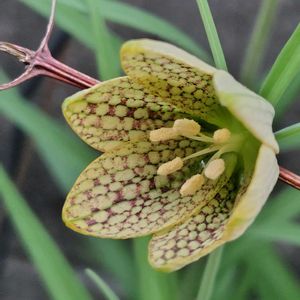 バイモユリ(貝母百合) フリチラリア・ツンベルギーとも網笠百合とも言うらしい。 毎年咲いてくれる魅力的なお花✨ 地味だけど、株のフォルムやお花の模様が風情があって大好き♡