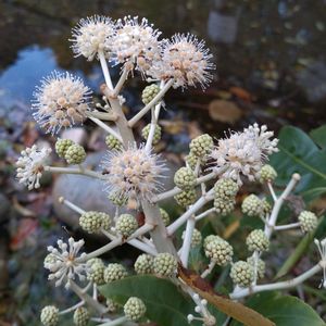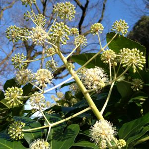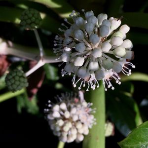 ヤツデ(八手)の花が咲いていました。 白い小さな花⚪が球体のような花序を作ります🎶 初めに雄花の時期があり、雄花の時期が終わった後から雌花の時期になるということです💕 1枚目は雄花主体、2枚目は雌花主体のようです🤍🌼😃