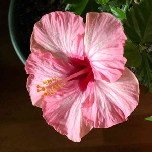 きょうのハイビスカス 何という品種か分からないけど オレンジ〜ピンクがいい感じのハイビスカスです(๑′ᴗ‵๑) クニャッとした感じの枝ぶりが独特のです